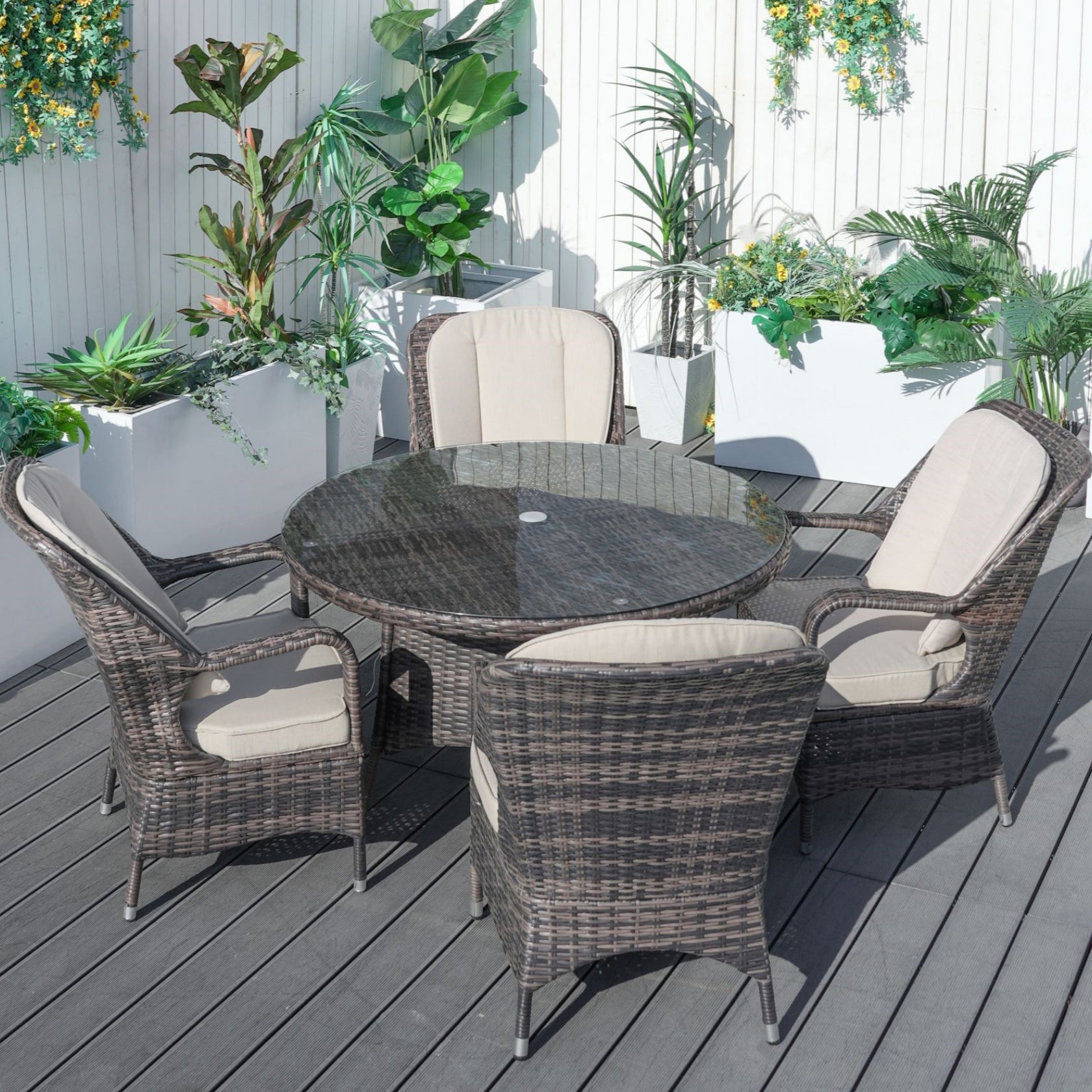 Topped with 5mm tempered glass and designed with a central umbrella hole, this set is both stylish and functional—ideal for patios and garden spaces. Plush seat and back cushions ensure comfort, while the low-maintenance materials make it easy to enjoy, season after season.