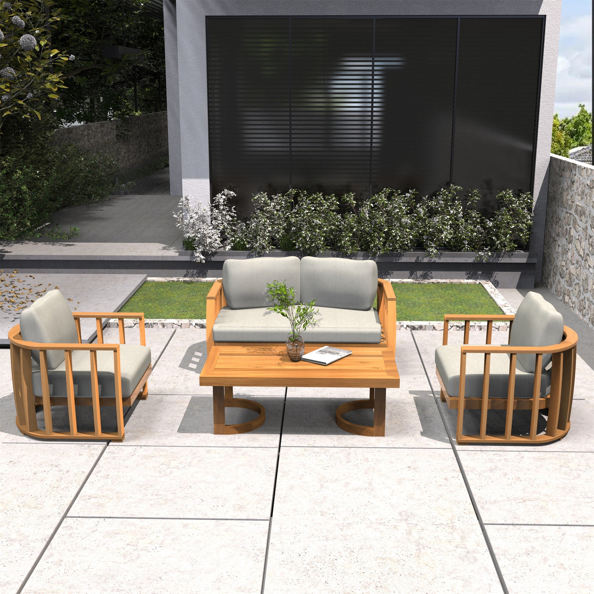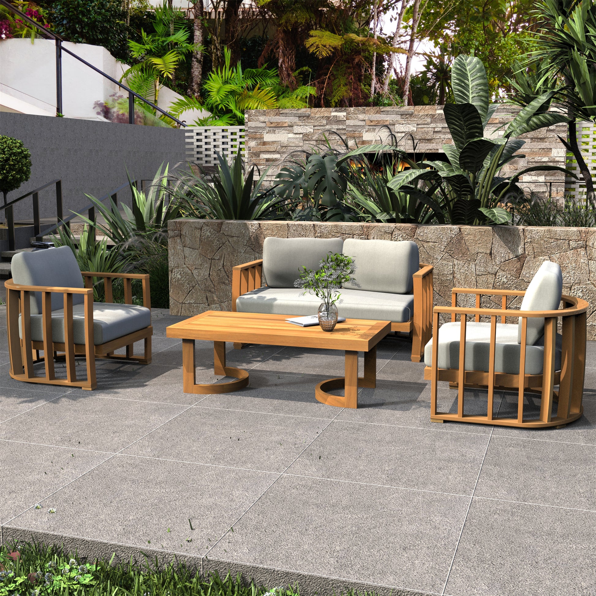 Bring refined style and comfort to your outdoor gatherings with this teak-color solid wood sofa set featuring a graceful curved-back design. Designed for 4 people, this set includes a two-seater sofa, two single sofas, and a spacious coffee table. Thick 4.7" seat cushions and 7" back cushions ensure luxurious comfort for hours of relaxation.