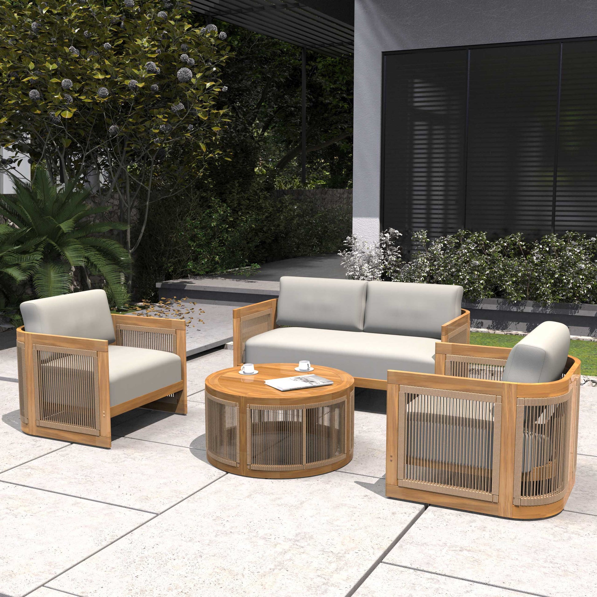 Upgrade your patio or garden lounge with this elegant 4-seat solid acacia wood sofa set. Designed with one spacious double-seat sofa, two individual armchairs, and a round wood coffee table, this set blends natural warmth with minimalist style. The smooth finish, thick cushions, and low-profile design bring effortless comfort to any outdoor space.