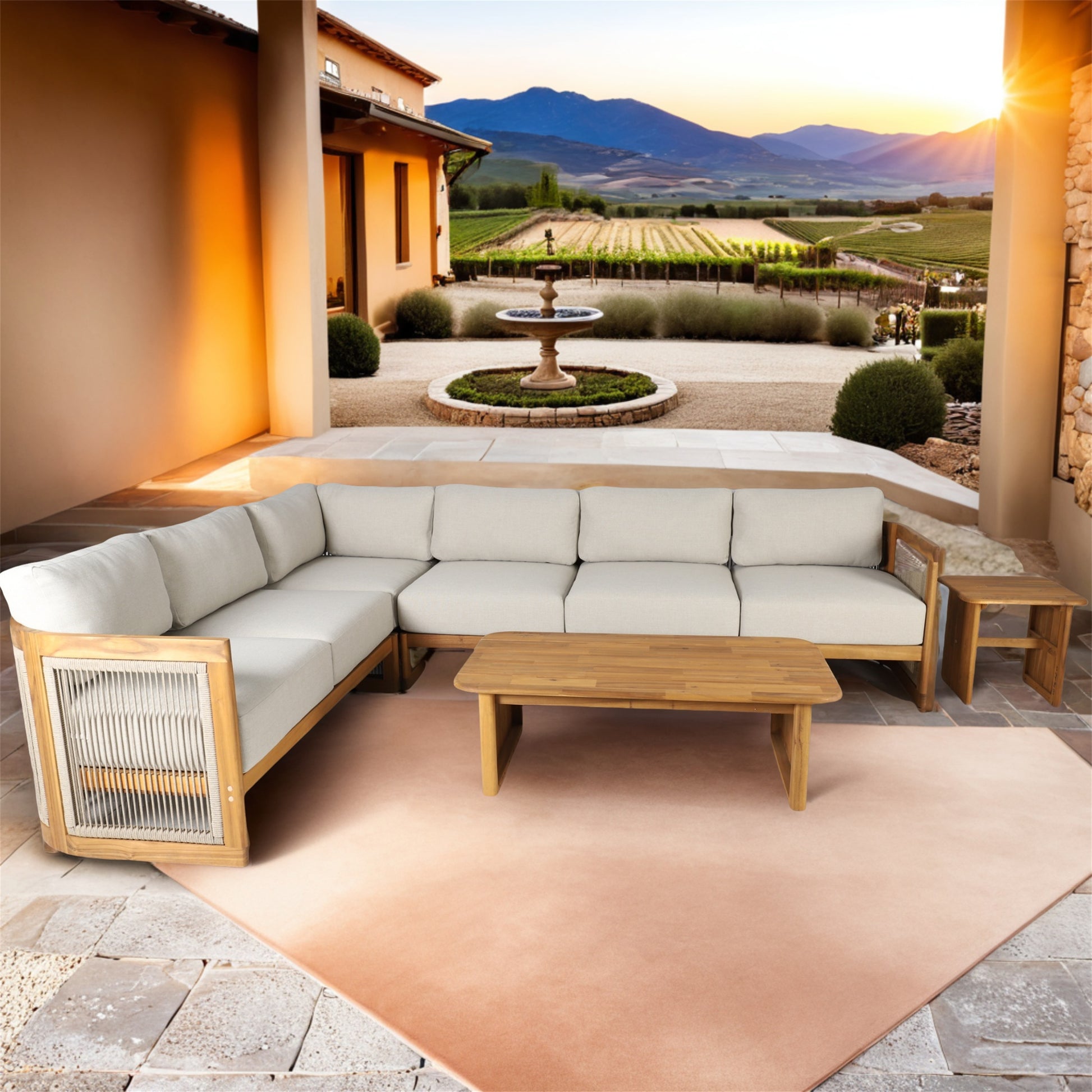 Create a versatile and elegant outdoor retreat with this 4-seat sectional sofa set, featuring left, right, middle, and corner modules. Combined with a spacious rectangular coffee table and a matching side table, this set provides flexible seating and functional surfaces for drinks, snacks, or décor. Made of premium solid acacia wood with smooth craftsmanship and plush 7.9" cushions, it blends comfort and durability for any patio or garden.