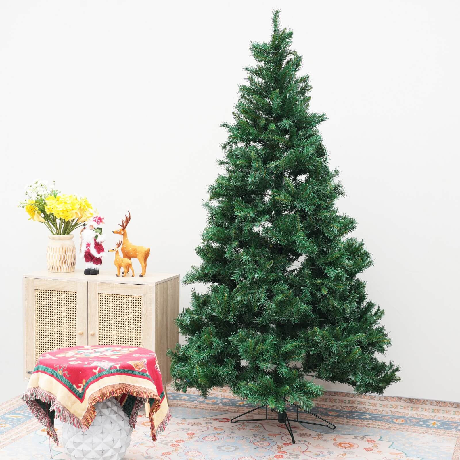 Christmas tree PVC new material, bottom pipe diameter 22MM, iron feet, with green drag line and green iron feet, tree height 183CM (including the base), the maximum diameter of the tree 109cm, 7 layers of total branches 976 head, PVC grass + tip + tail length thickness: 7+3.8+0.1+0.12CM, base main 2.2*45cm.