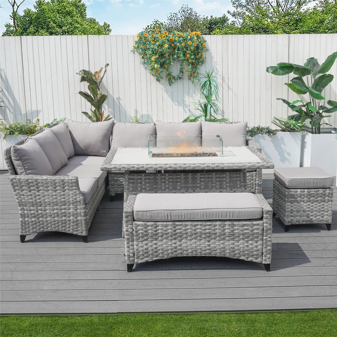 - Versatile Seating: The combination of sofas, a bench, and an ottoman allows for flexible arrangement options, perfect for any outdoor occasion.