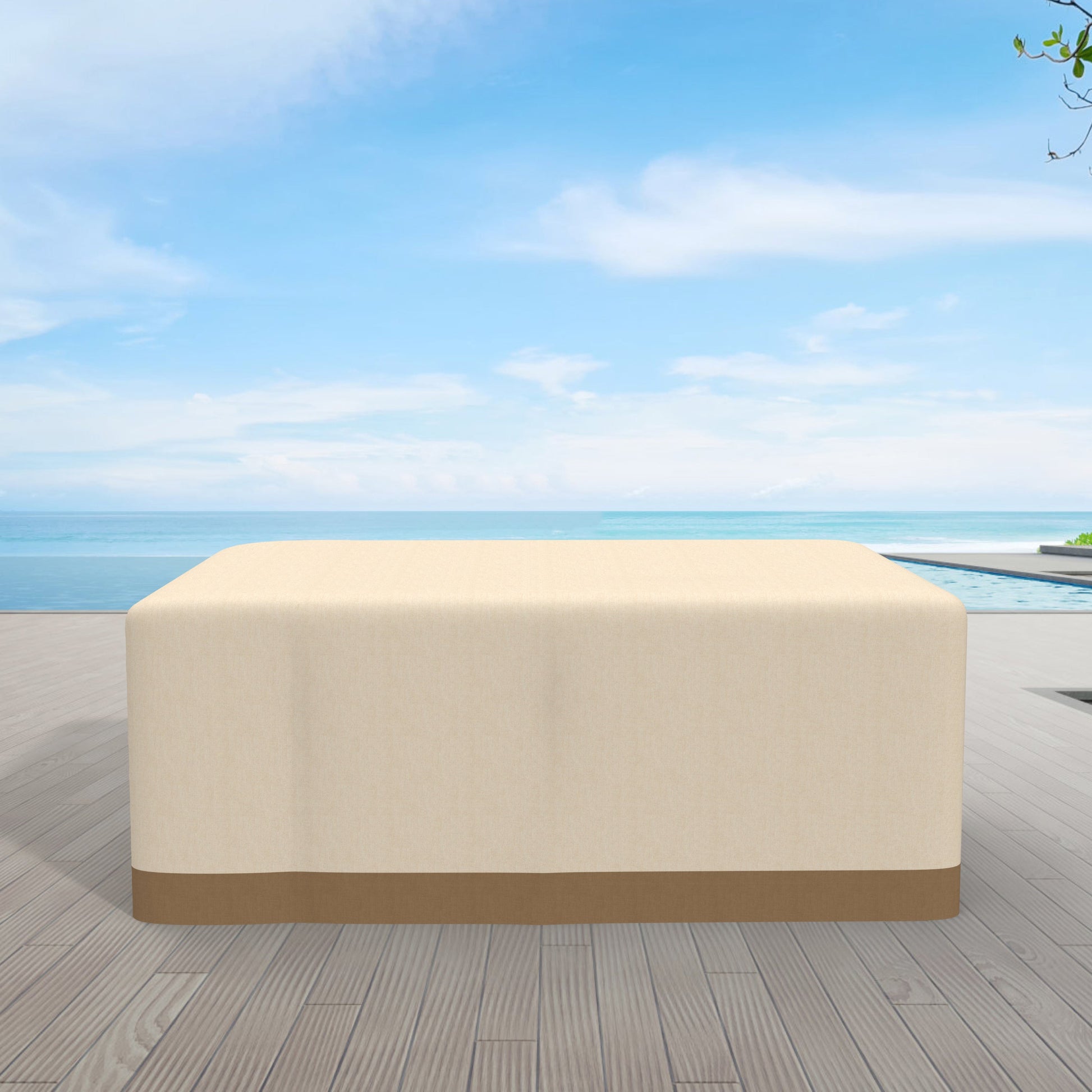 Protect your PAG-1106-Rectangle Firepit Table with the Direct Wicker Beige Outdoor Rain Cover. Designed for maximum protection, this rain cover features durable, high-quality materials to safeguard your outdoor furniture from the elements. Its unique construction includes a four-corner pressing line, a lower skirt that curls inward, and built-in 4mm cotton rope with spring buckles to ensure a tight and secure fit.
